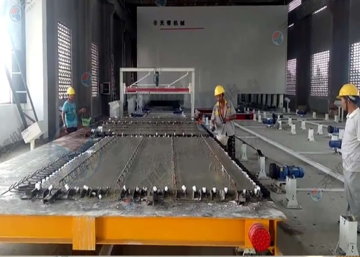 PC環(huán)形疊合板/內墻板生產線的主要設備包括雙梁橋式起重機、清理機、脫模劑噴涂機、布料機、振動臺、趕平機、拉毛裝置、預養(yǎng)窯、抹光機、碼垛車、養(yǎng)護窯、翻轉機、擺渡車、支撐滾輪、驅動輪、模臺和成品運輸車等。